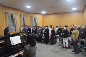 今年の合唱団は42名。12月の練習では、鏡谷さんが各パートの音程を確認し、全員で声を合わせ、それを聴いた林さんが発音などをチェック。メロディの美しさはもちろん、ハーモニーの豊かさ、声が響き合う迫力に圧倒されました。鏡谷さんは「皆さんとても熱心。最初は声が合わなかったけれど、徐々にまとまっていき、一つの合唱団に育っているなと感じます」と話していました。